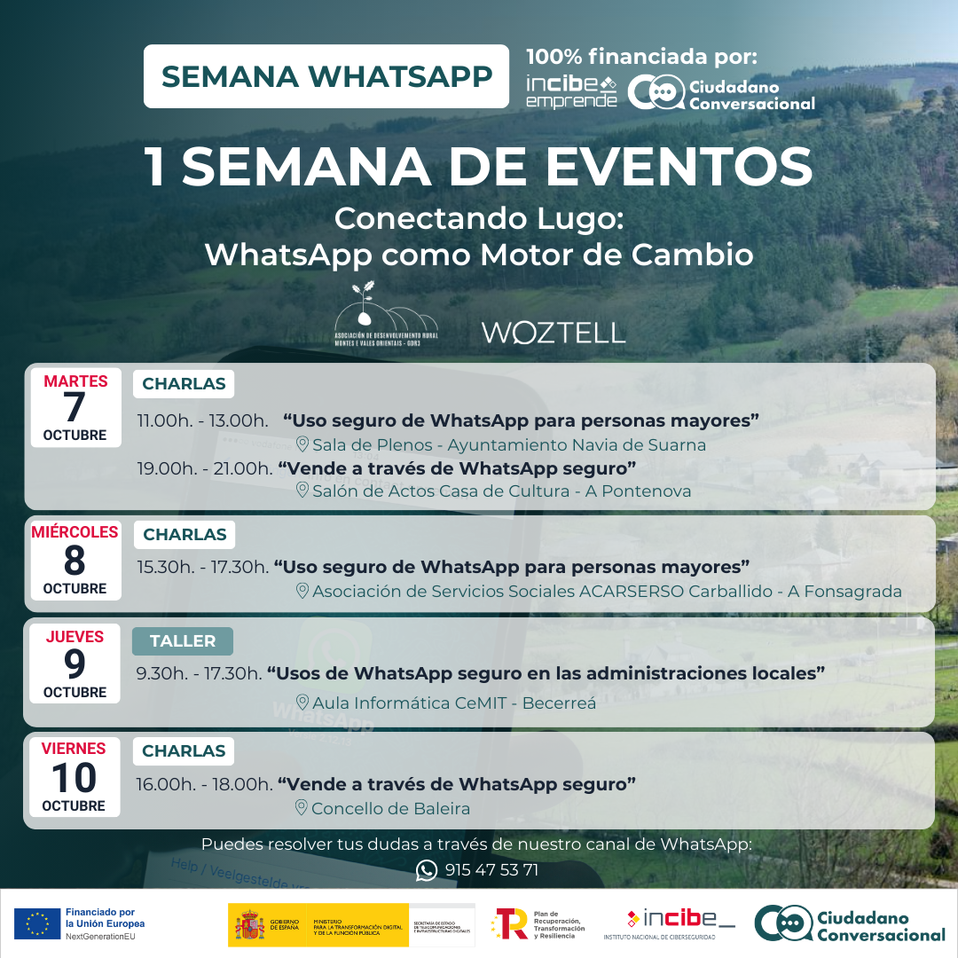 A Semana “WhatsApp como Motor de Cambio” en Lugo conta coa colaboración dos concellos de Navia de Suarna, A Pontenova, A Fonsagrada e Becerreá, institucións que respaldan a formación dixital como ferramenta de desenvolvemento local e que poñen en valor o seu patrimonio natural, cultural e social.